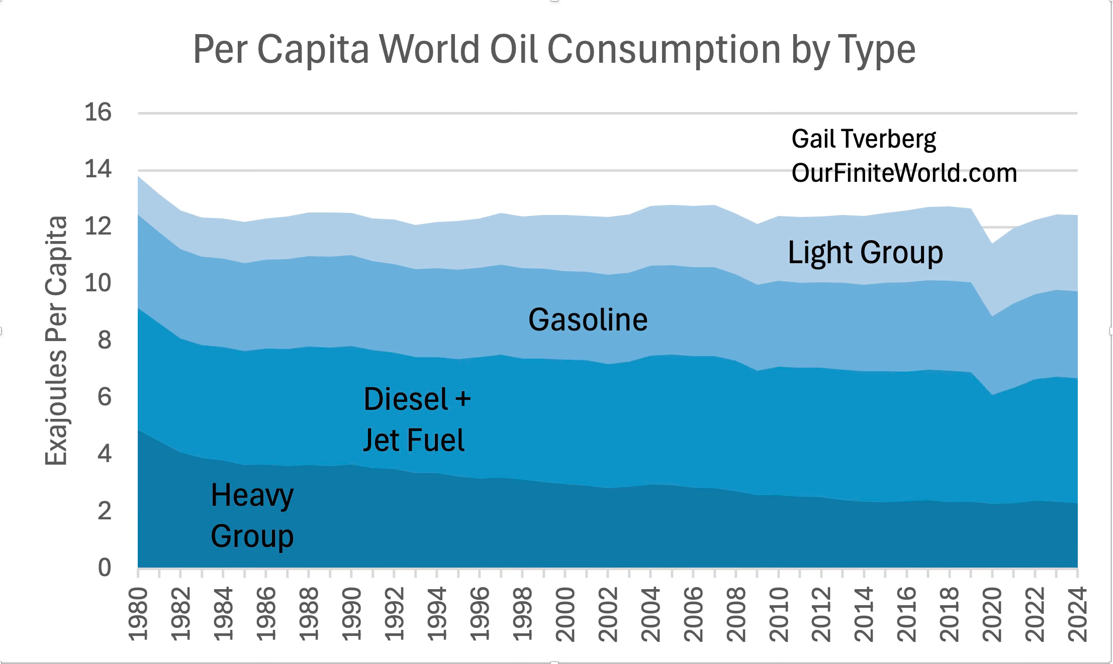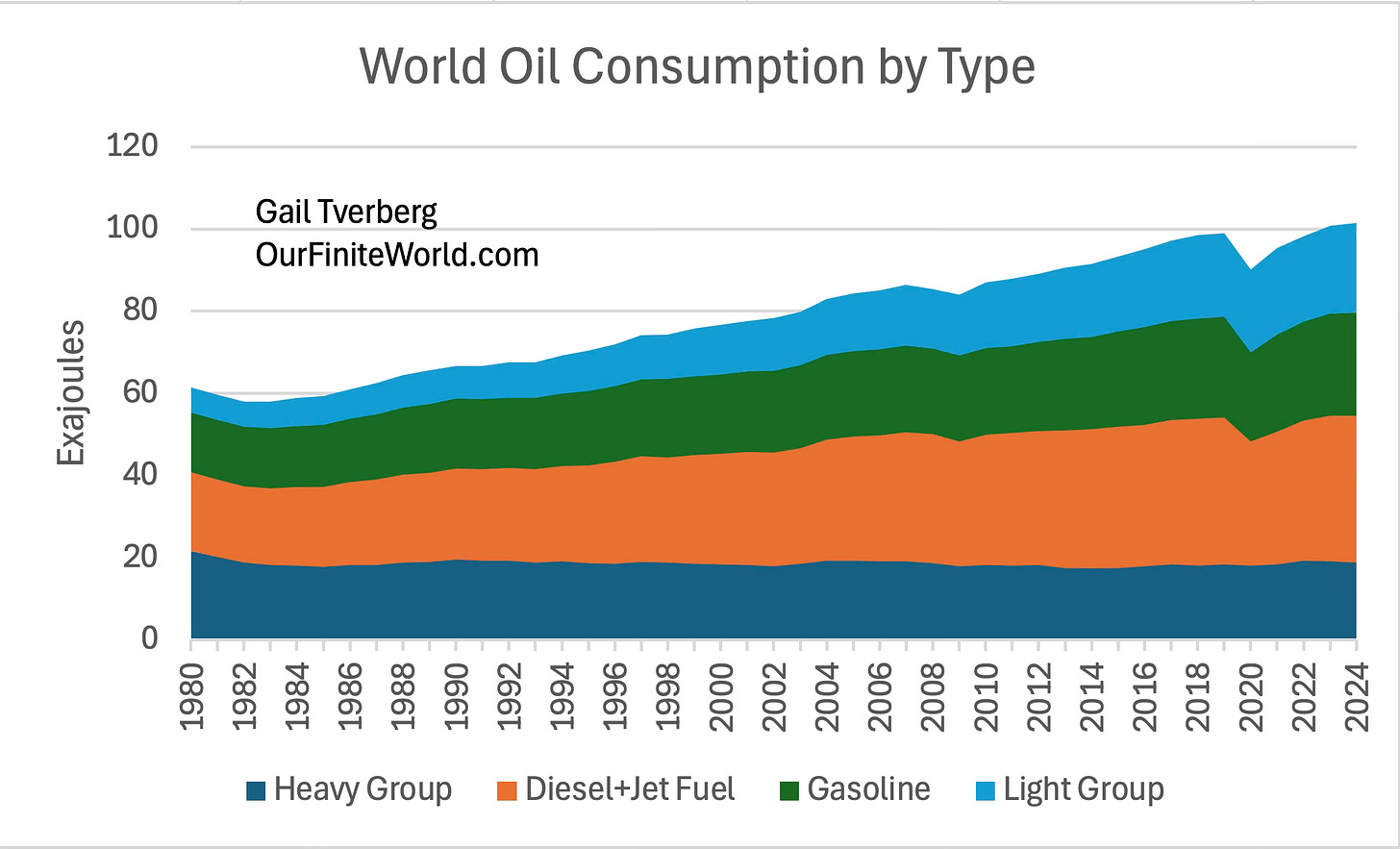 A chart summarizing the consumption of different types of oil, based on data from the 2025 Statistical Review of World Energy, is as shown in Figure 3. Note that the Diesel+Jet Fuel layer is the product grouping with the largest consumption. In the US, we hear a lot about Gasoline, but Diesel+Jet Fuel is the layer with the greatest fuel consumption. Diesel+Jet Fuel provides a huge quantity of services, but its usage is mostly hidden from sight.