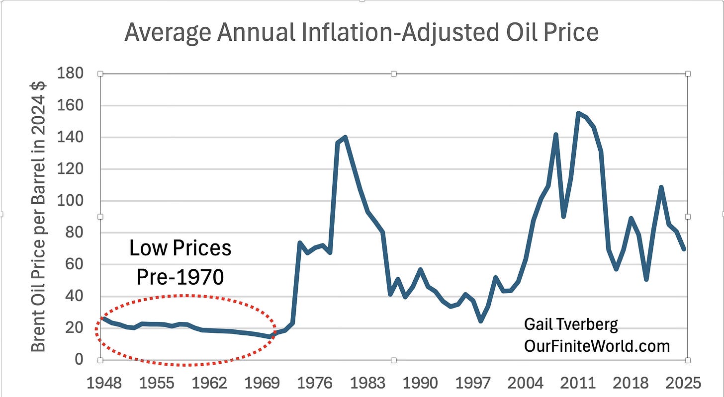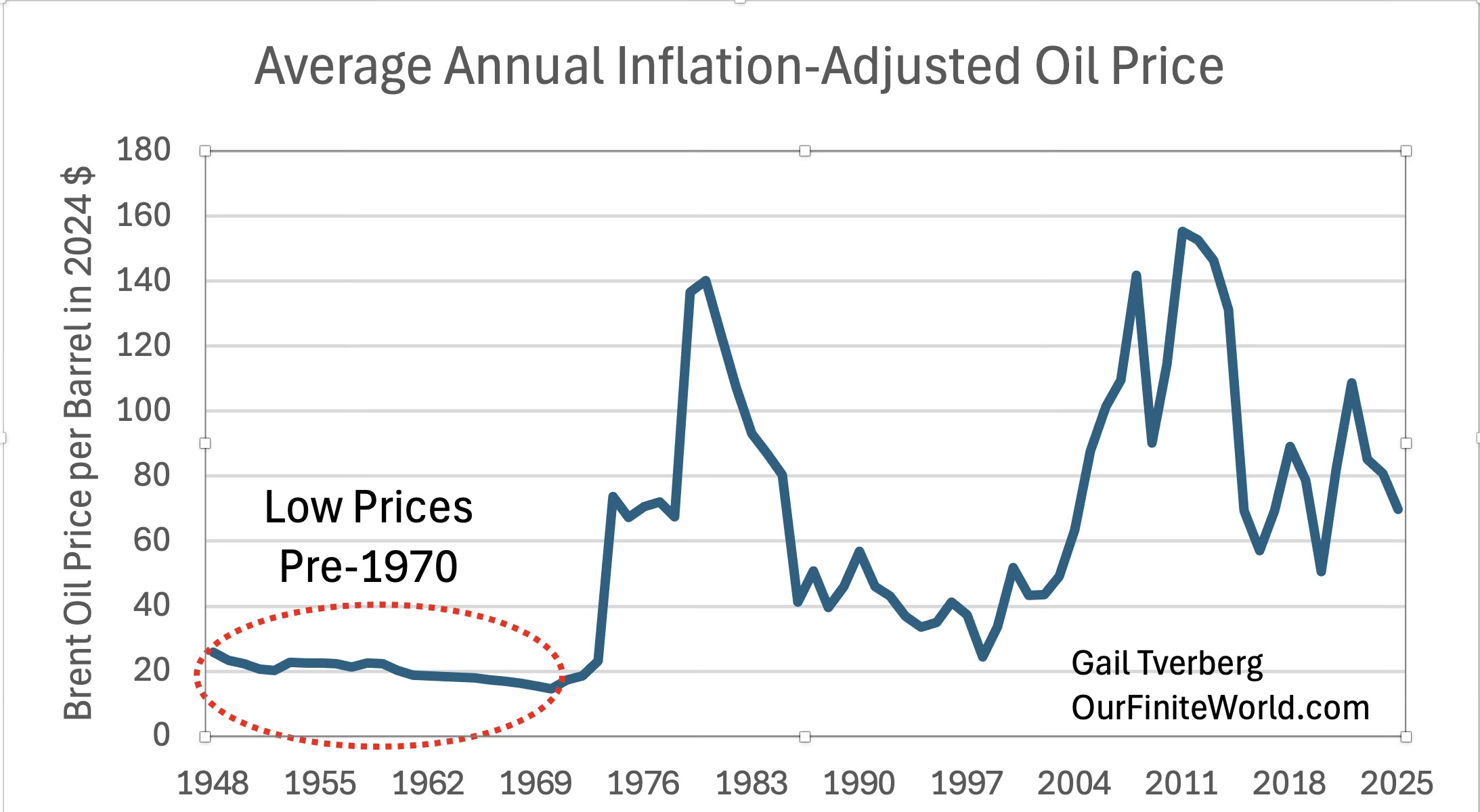 Figure 2 smooths out some of the price irregularities. For example, there was a very high peak in July 2008, but the price fell to a low level by December of the same year. The peak doesn’t appear very high on this chart, but it greatly affected financial markets. See my article, Oil Supply Limits and the Continuing Financial Crisis.
